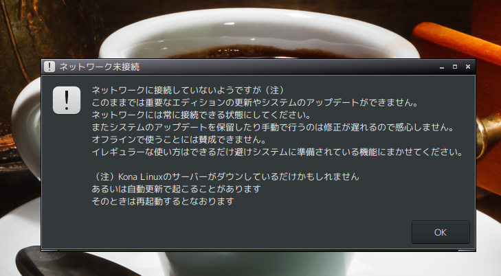 初めてこの状態になったのが10月6日でKonaLinux4.0(32bit)で、覚えてる限りでは前日にアップデートと自動更新が入っていた。