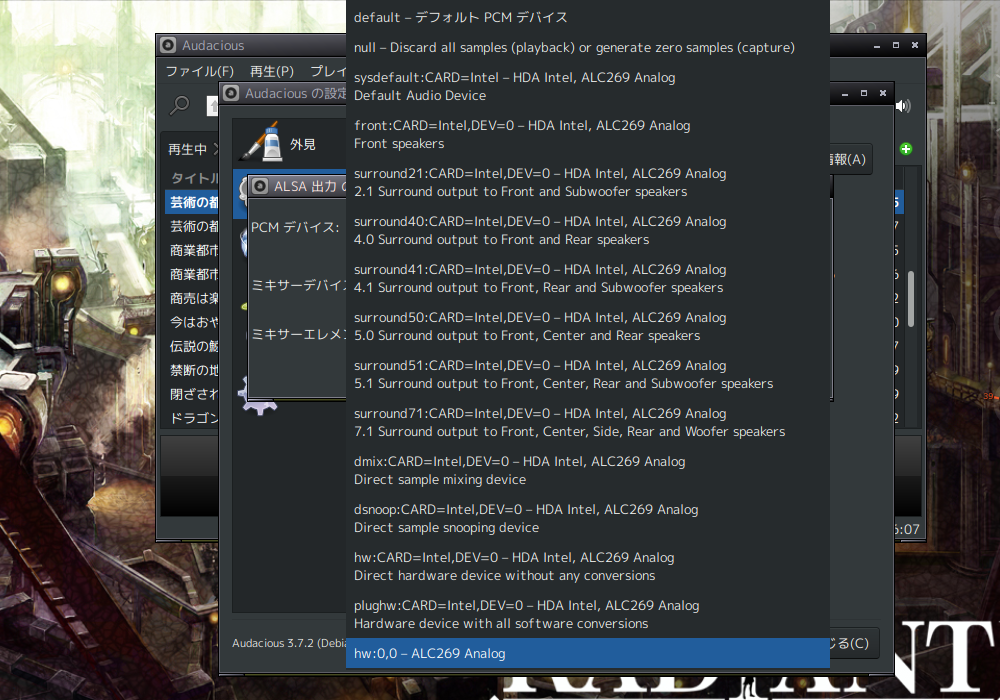 一応「ALSA出力」でも、横のタブの「設定」から色々変更は可能で、デフォルト以外なら音がなるものもあったので、まーなんかそこらへん設定変えて遊べるのかなあとは。自分はやらないが。というか「PalseAudio出力」で合ってたんだろうか。