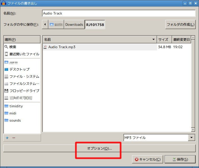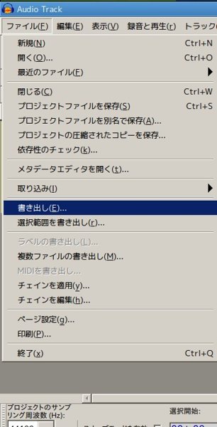 MP3への変換は「書き出し」から行う。ちなみに、その上にある「取り込み」でMIDIファイルも取り込むことが可能らしいのだが、ここから直接MP3には出来ないっぽいので、MIDIデータを他データに変換したい場合はTimidityを使うか、Timidityで再生している音をAudacityで録音するかになるかと。Windowsでこれをしたときは今は亡きWinampを利用したんだったかな。
