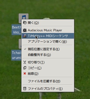 インストールすると、MIDIファイルを右クリックすると選択肢の中に「Timidity++ MIDIシーケンサ」が出てくるので、それを選択するとTimidityで再生となった。 ちなみに、ダブルクリックだと自分の環境では「Audacious」が立ち上がった。