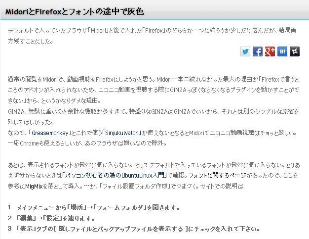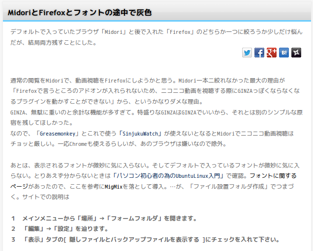 Firefoxのデフォルトはやっぱり「Ubuntu」。いいんだけど、ゴシックゴシックしすぎててあまり隙ではない。なのでこちらもMigMix1Pに変更。
