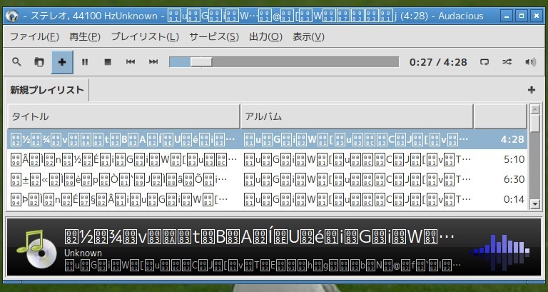初回に起動したときはCDを再生させていたので気が付かなかったのだが、Windowsで取り込んだMP3を再生すると、表示が「豆腐」になった。ヤッター!なんかすごく「Linux使ってる」気分になった!ヤッター!…当たらなければいいとは思っていたが、一度は体験してみたかった、文字化けの「豆腐」。ファイルを開く時点では普通に日本語で表示されていたので、パネル表示が文字化けする模様。