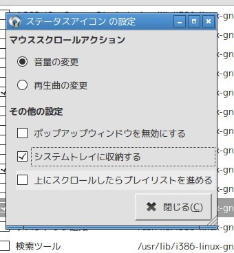 「ステータスアイコン」にチェックを入れた時点で、システムトレイには収納される設定にはなるが、最小にしてもタスクバーに残り、右上の「☓」を押すとソフトが終了してしまうので、設定項目に「システムトレイに収納する」にチェックを入れる。これで閉じても表示アプレットに収納されて、自分としては満足。