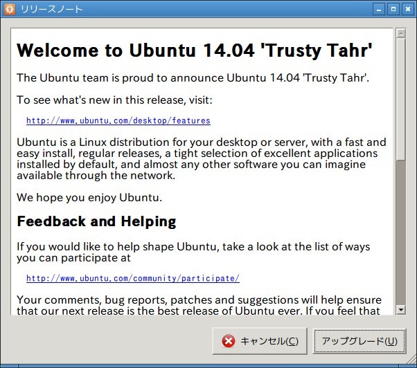 数か月前からZorinOS Lite 6.2 Rimixのアップデートマネージャーを起動させるとこの様に「Ubuntu14.04にアップグレードしませんか」と出てくる。アップグレードしなくて も確かベースはUbuntu12.04だったはずだから、17年までサポートありじゃなかったか?と思う一方で、ベースがUbuntu12.04じゃな く、Lubuntu12.04という話もあり、そっちだとサポートが13年に切れてると言う話でもあり。一体どっちなんだ?