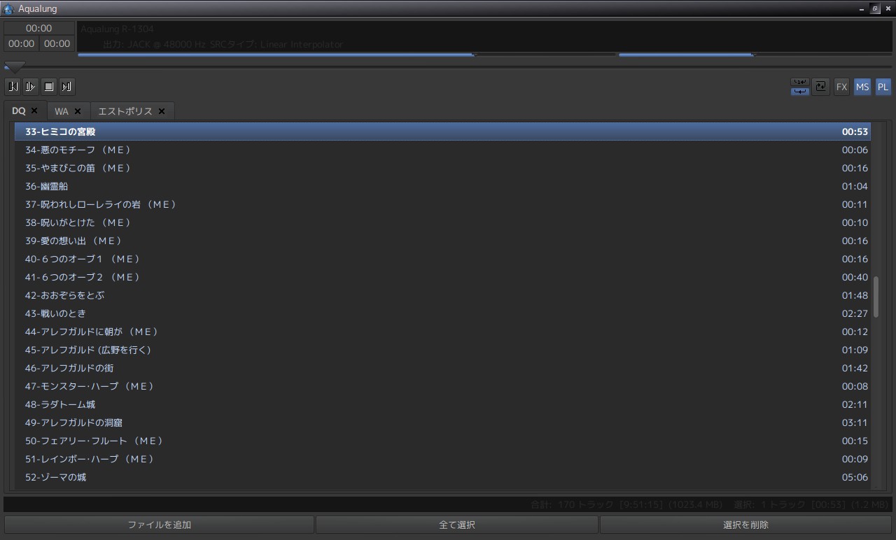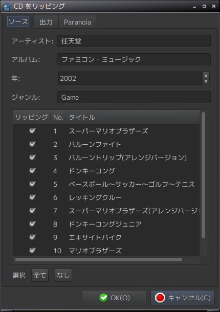 Linuxでリッピングしたデータの場合は大丈夫だと思うが、Windowsで取り込んだデータの場合、たまにタイトルが文字化けして「豆腐」状態なことがある。Audaciousだとそこら辺平気なんだが、Aqualungはそのへんとても弱いし。