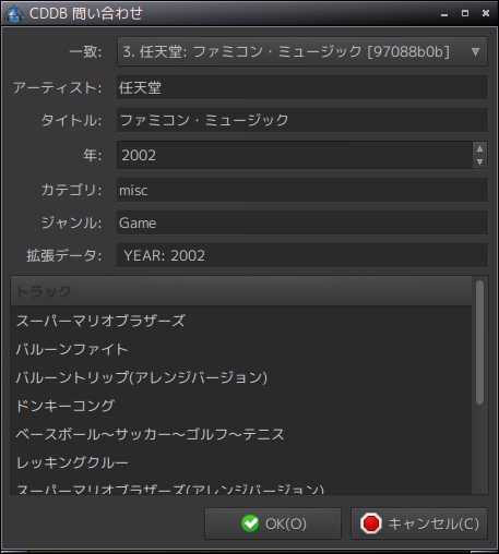 「CDDBに問い合わせ」をすると、アルバム単位で検索ができる。