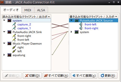 「読み込み可能なクライアント」と「書き込み可能なクライアント」両方に「pulseaudio jack sink」があればよし、時々「書き込み可能なクライアント」側にしか「pulseaudio jack sink」がないときもあり、この状態でJackaudioを再起動させた場合、両方共「system」しかロードされない状態になるので、なんとも。