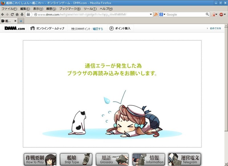 艦隊これくしょんの大型メンテナンスが金曜日に入ったのだが、メンテ終了後にログインしようとすると、通称エラー娘さんの画面に飛ばされるようになった。