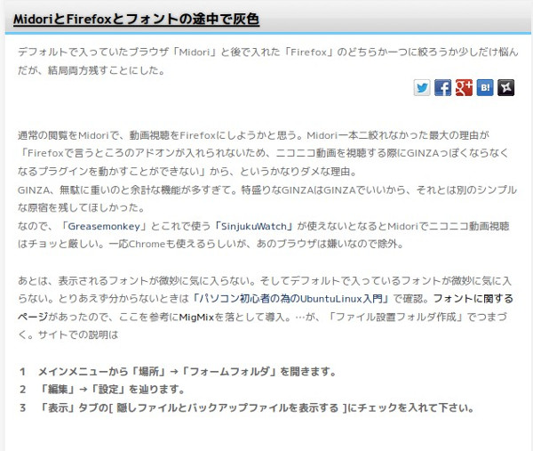 Firefoxのデフォルトはやっぱり「Ubuntu」。いいんだけど、ゴシックゴシックしすぎててあまり隙ではない。なのでこちらもMigMix1Pに変更。