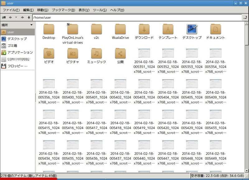 先ほどZorinを立ちあげ、home/(自分のユーザー名)ディレクトリを開く。ZorinOS Lite Rimixの初期設定なのか、home直下の自分のユーザー名が入るはずのディレクトリが「user」なのはさておき。自分のユーザー名、userで登録した記憶がないのだが、はて。