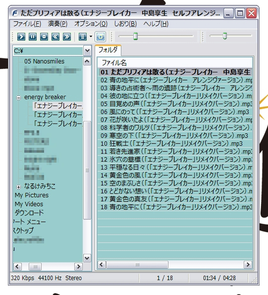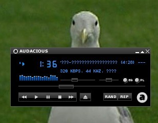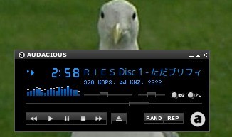 初回に起動したときはCDを再生させていたので気が付かなかったのだが、Windowsで取り込んだMP3を再生すると、表示が「豆腐」になった。ヤッター!なんかすごく「Linux使ってる」気分になった!ヤッター!…当たらなければいいとは思っていたが、一度は体験してみたかった、文字化けの「豆腐」。ファイルを開く時点では普通に日本語で表示されていたので、パネル表示が文字化けする模様。