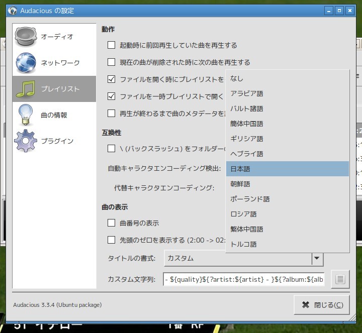 「設定」から,[ プレイリスト ]タブを開いて下さい→[ メタデータ ]項目の「自動キャラクターエンコーディング検出」欄を「日本語」に設定してください』となっていたが、多分古いバージョンだからか、メタデータ項目ではなく