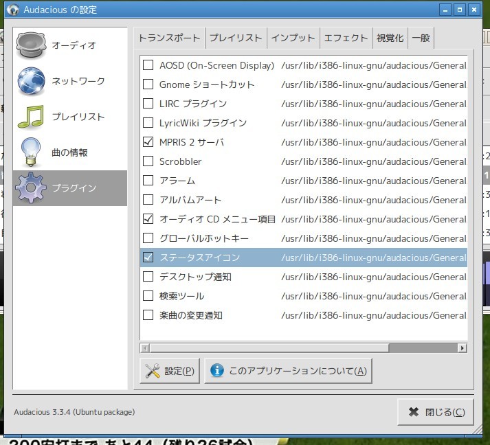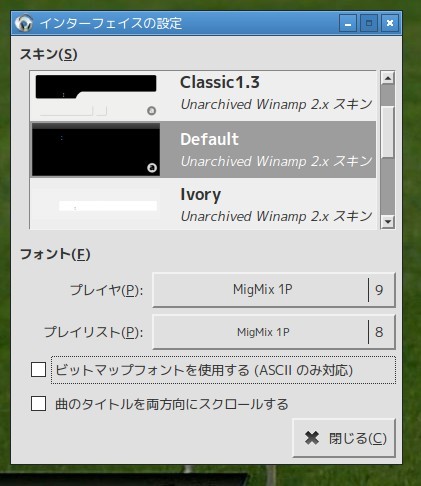 『 Audaciousの左上のマークをクリックして「設定」から,[ 外観 ]タブを開いて下さい』となっていたが、現在のバージョンでは