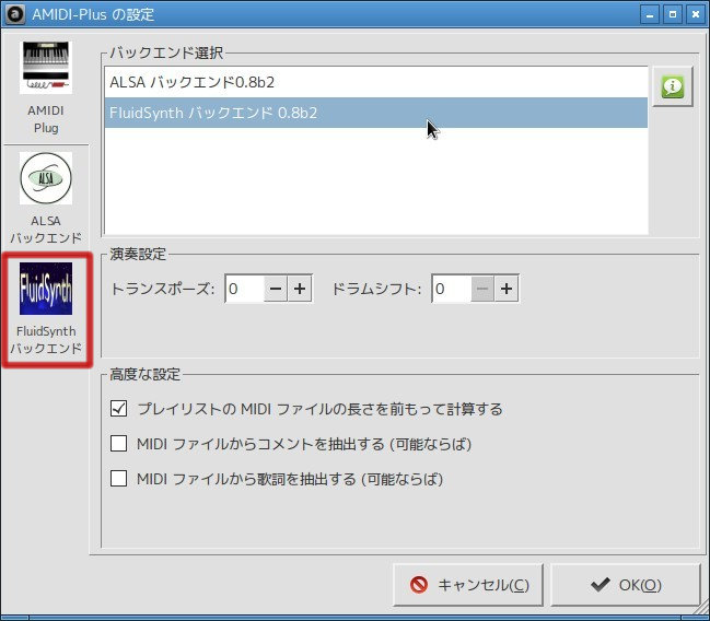 [FluidSynth バックエンド]を選択してから、左のタブでも