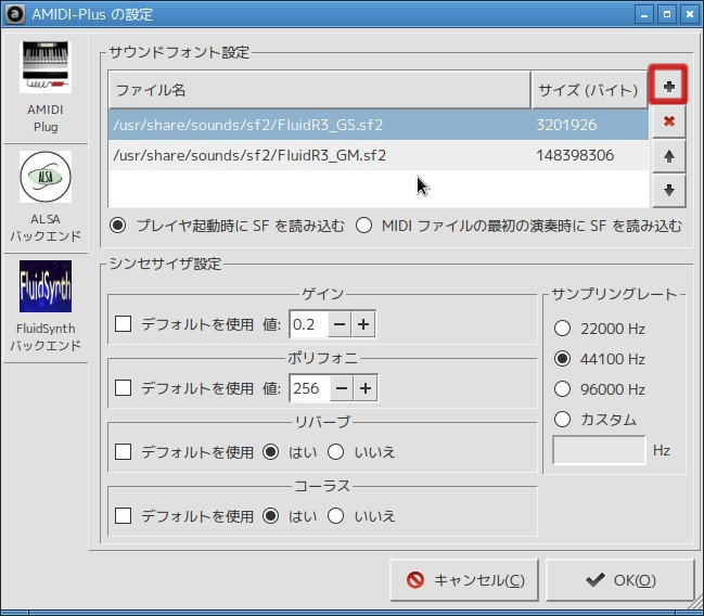 右上の「+」ボタンをクリックして選択画面を呼び出し、先程ターミナル画面でインストールした「FluidR3 GM.SF2」と「FluidR3 GS.SF2」を導入。一度に2つ導入はできないので、ひとつ導入してから、フォーカスを合わせた状態でも一度「+」ボタンを押してもうひとつを導入。