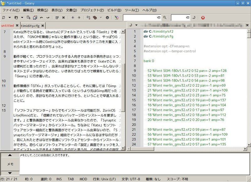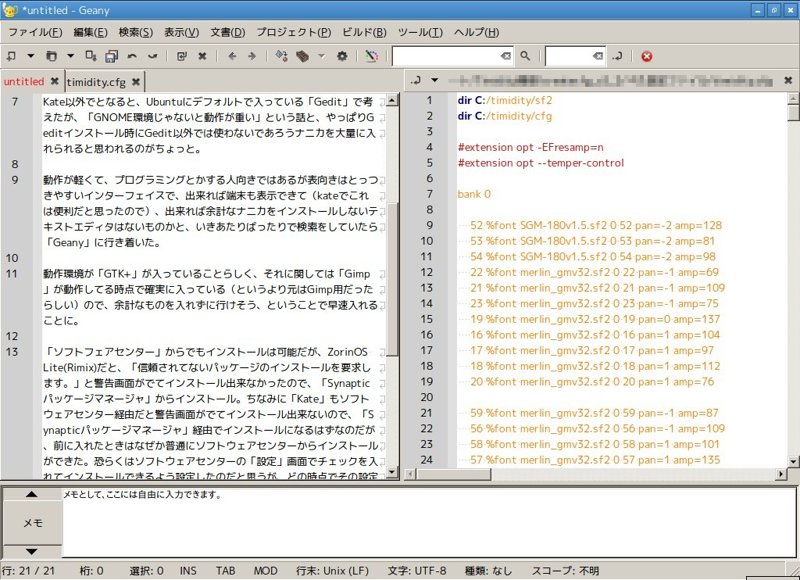 「Kate」も良かったのだが、KDE環境用のエディタなためか、インストール時に「Kate」以外では使われないであろうナニカが大量にインストールされるのと、保存時など何かのアクションを行うと音が鳴り、それを止める設定がわからなかったのと、「/usr/share/sounds」以下にフォルダも作らずにwaveファイルを大量に置かれたのに腹がたち、適当に「KDE」とフォルダ名をつけて、その中に大量のwaveファイルを突っ込んでから「Kate」を起動させたら、なぜか日本語化されていたものが、英語に戻されたので、残念だがKateとはご縁がなかったのだと諦めることにした。