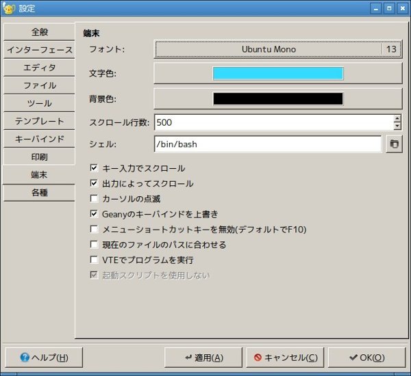 「編集」→「設定」で様々な設定の変更が可能。その中に「端末」があるので、そこから文字も色も変更ができた。…この設定をエディタ領域にも欲しかった。