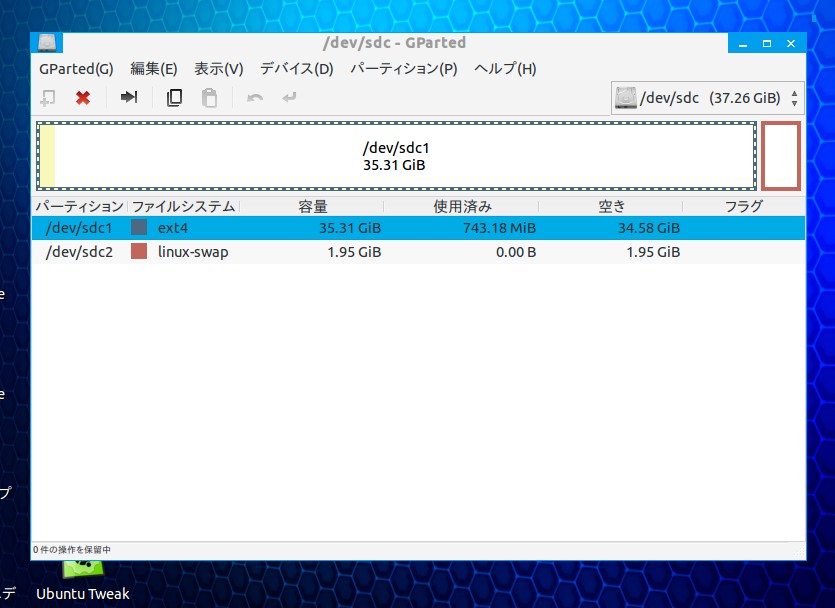 LiveCDでZorinOSを立ち上げ、「GParted」を起動させ、それから外付けHDDをUSBに挿して、どっちのHDDがどっちなのかを確認する。XPマシンで外付けHDDをフォーマットかければよかったと後で気がついたが、成り行きでそのまま続行。PC本体の方が「sda」で、外付けHDDの方が「sdc」。忘れないようにメモをとる。